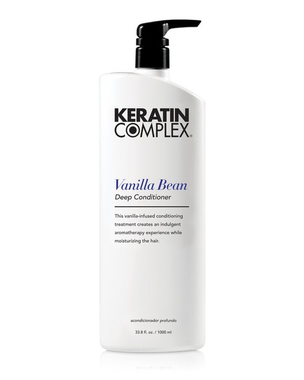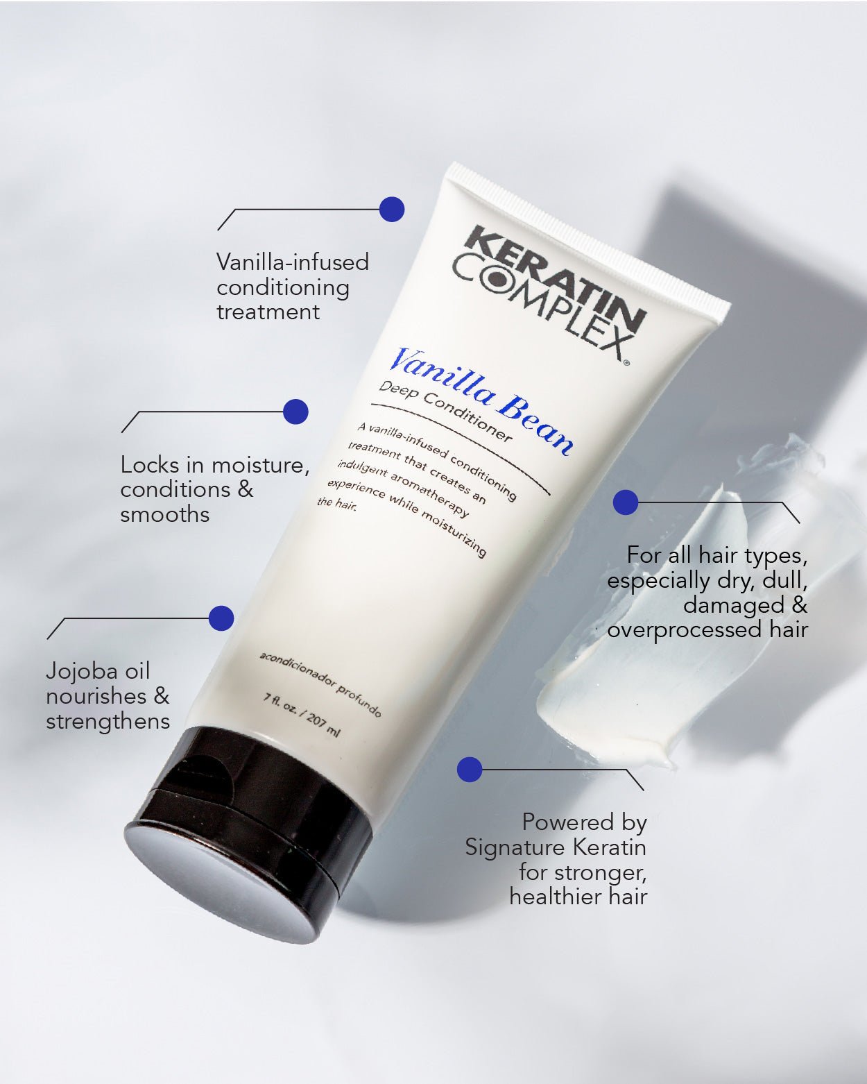 Shampoo the hair with Keratin Complex shampoo. Apply a small amount of Vanilla Bean Deep Conditioner in small sections. Distribute throughout the hair, concentrating on the ends. For an intensive conditioning treatment, cover your hair with a plastic cap for 10–20 minutes. Rinse thoroughly. Style as desired.